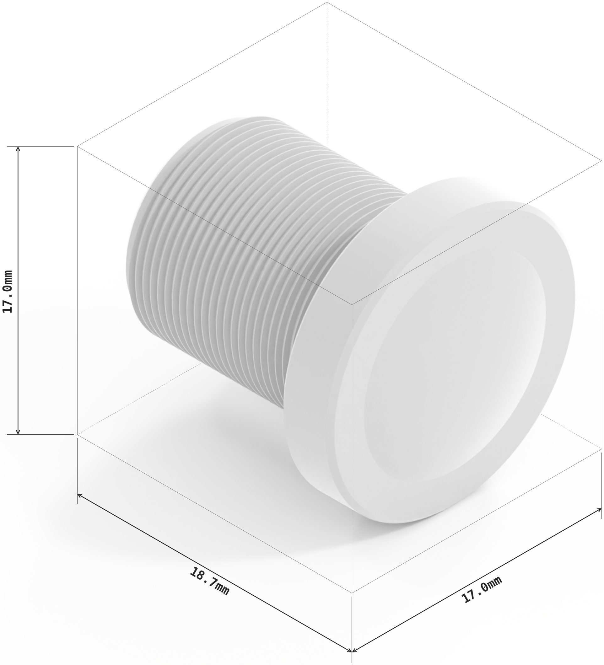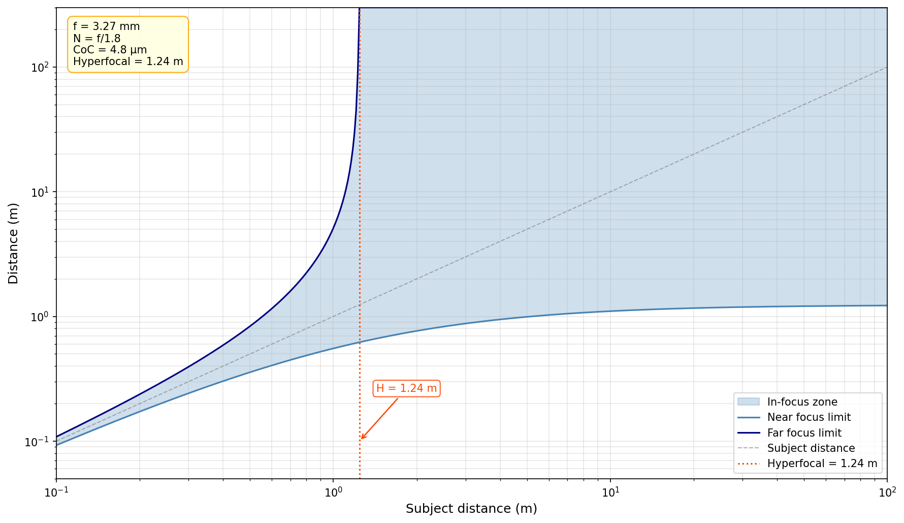 The depth of field chart shows the near and far focus limits as a function of subject distance for a given f-number. The circle of confusion (CoC) defines the largest blur spot that still appears sharp in the final image. Here it is set at the Nyquist limit - twice the pixel pitch - which represents the smallest detail the sensor can physically resolve. Short focal length lenses produce inherently deep depth of field. In many cases the hyperfocal distance is well under one meter, meaning everything beyond that distance is acceptably sharp without refocusing. This is especially relevant for surveillance, machine vision, and multi camera rigs where active focus adjustment is impractical or undesirable.
