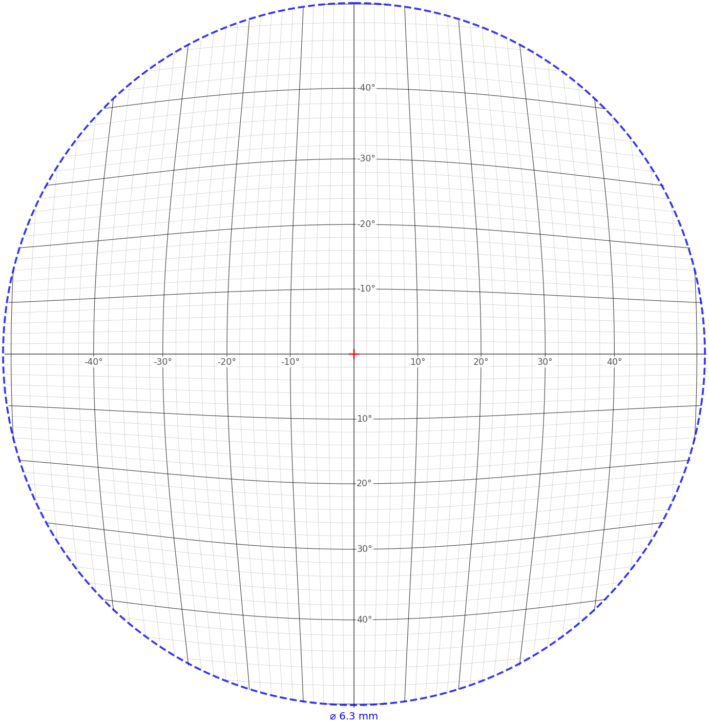 The field angle map shows iso angle contour lines projected through the calibrated lens model onto the sensor plane. Each line represents a constant field angle from the optical axis outward. Straight, evenly spaced lines indicate clean rectilinear behavior. Curved or compressed lines reveal barrel or pincushion distortion. The blue dashed circle marks the image circle boundary - beyond it, no usable image is formed. All content outside the circle is clipped for clarity. This map is the quickest way to evaluate how a lens distributes angular information across the sensor and whether the distortion profile is suitable for your application.