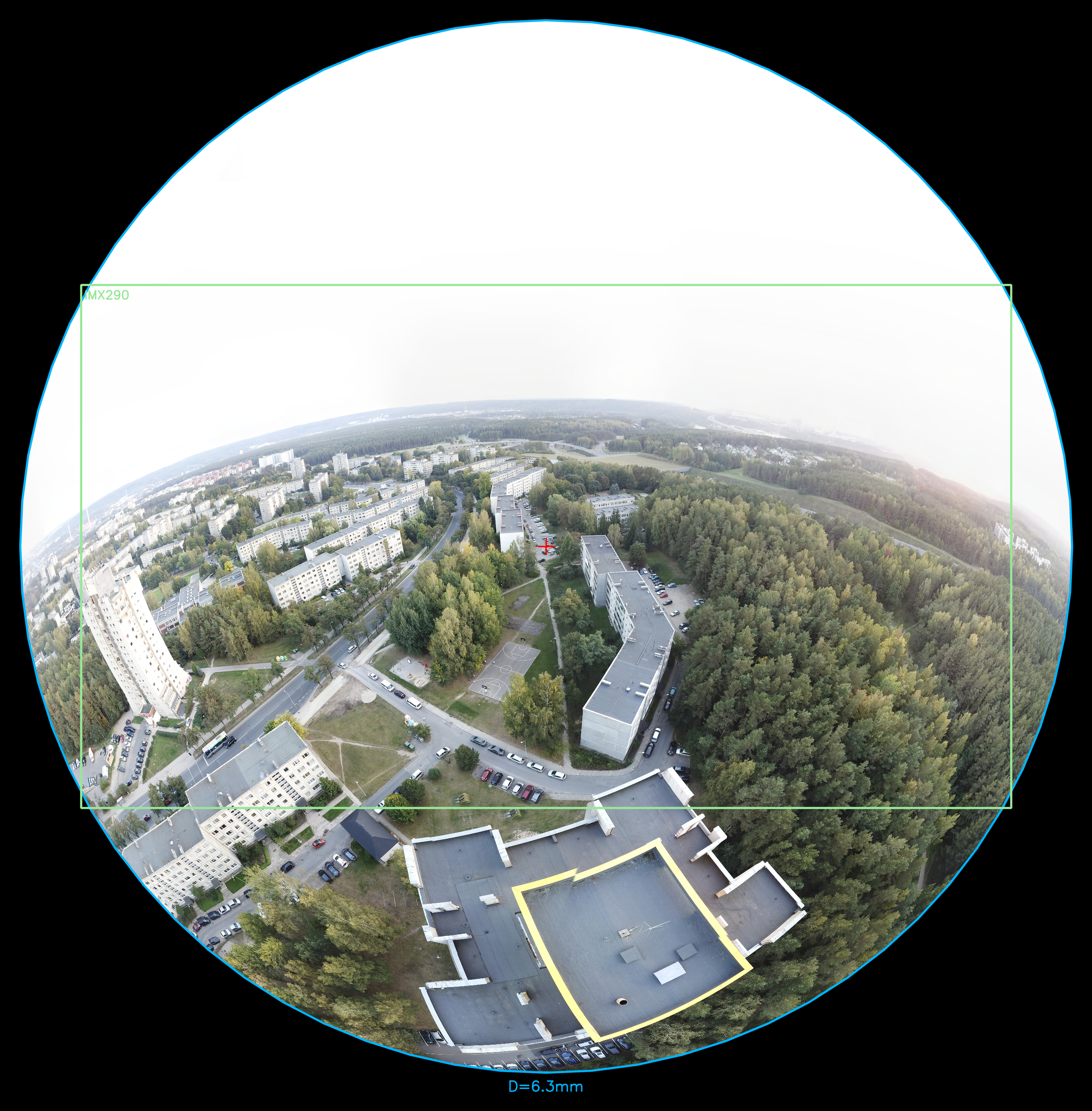 The panorama projection renders a full 360x180° equirectangular scene through the calibrated lens model, showing exactly what the camera would capture in a real environment. The image is generated by tracing rays from every pixel through the lens distortion model into the panorama, producing a geometrically accurate view that includes all barrel distortion, pincushion, and field curvature native to the optic. The image circle boundary marks the physical limit of the lens illumination - pixels outside it receive no light and are masked black. Sensor overlays drawn inside the circle show how much of the projected scene each sensor format actually captures, making it immediately obvious whether the sensor is under-filling or over-filling the image circle. Wide angle and fisheye lenses compress a large solid angle into the circle, pulling peripheral detail toward the edges where pixel density drops and distortion increases. Narrow lenses frame a smaller portion of the scene but preserve straight lines and uniform sampling across the field. The principal point crosshair marks the optical axis where resolution peaks and distortion is zero. Comparing this projection across different lens and sensor combinations reveals the practical tradeoff between field of view coverage and per-pixel fidelity - the same scene detail that fills dozens of pixels at image center may occupy only a few pixels near the circle edge, directly impacting detection and recognition capability at the periphery.